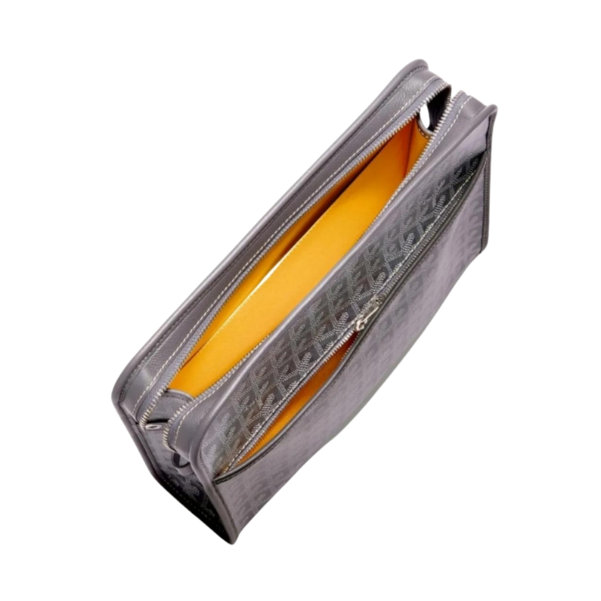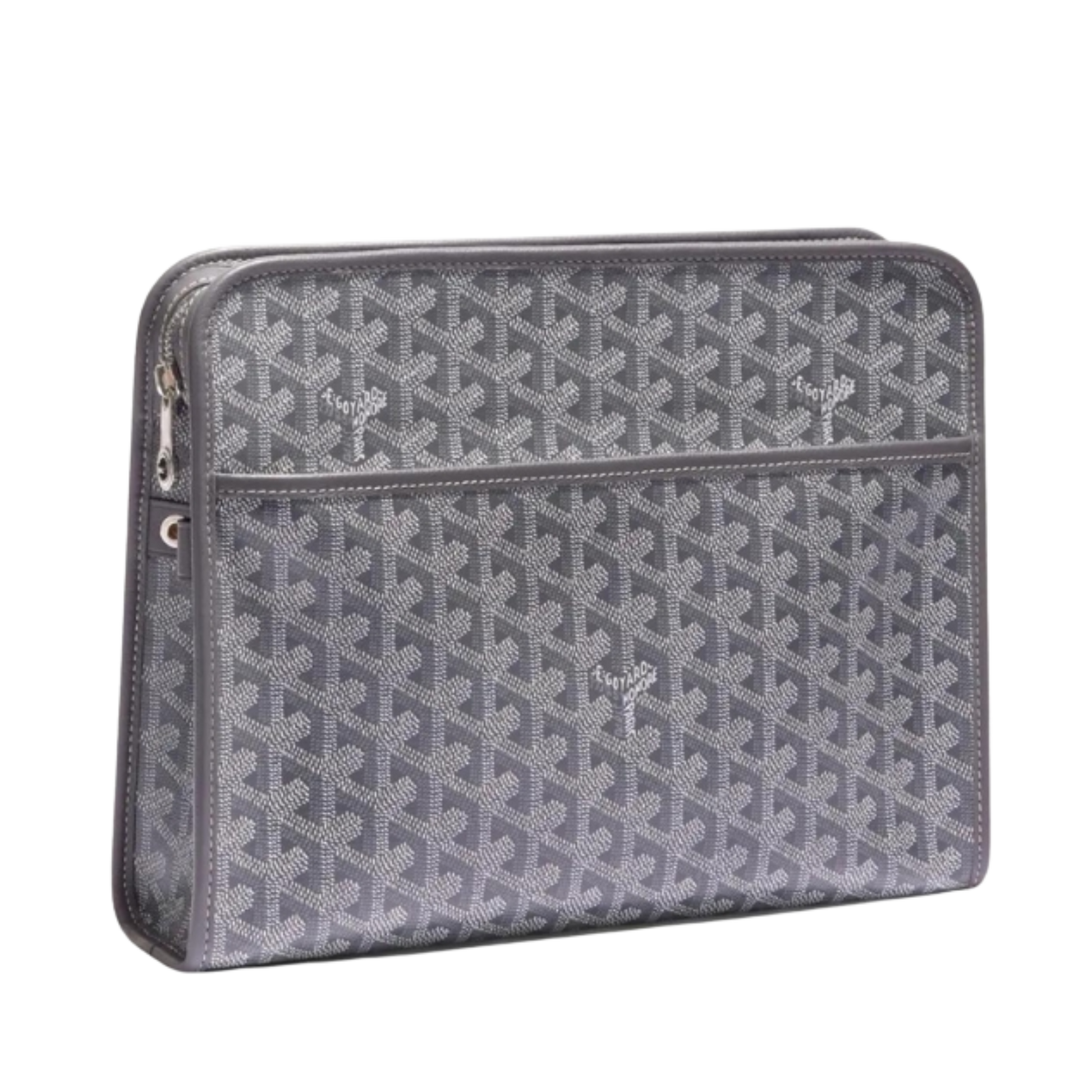 Goyardine Jouvence GM Toiletry Pouch in Grey by GOYARD. This adorable pochette is made from grey Goyard chevron monogram canvas. The pouch has a front zipper compartment with gray leather trim. A patch pocket and yellow fabric interior are accessible through the top zipper.