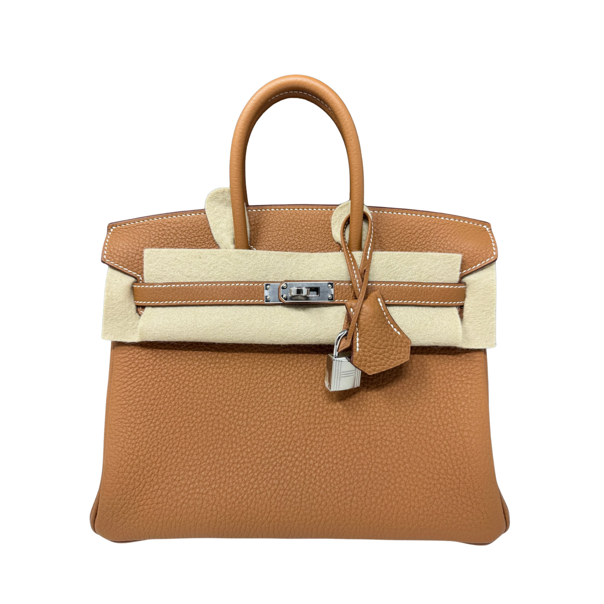 A timeless classic that epitomizes luxury is the Hermès Birkin 25 in gold. Crafted by hand from the finest leather, it features a rigid yet elegant design and flawless stitching, showcasing the distinctive Birkin silhouette. Polished hardware adds to the rich tone of the warm gold color, which is one of Hermès' most recognizable hues. This piece, which is small and sophisticated, is a testament to the Maison's outstanding craftsmanship and continues to be a representation of sophistication and timeless style. includes a Rodeo charm