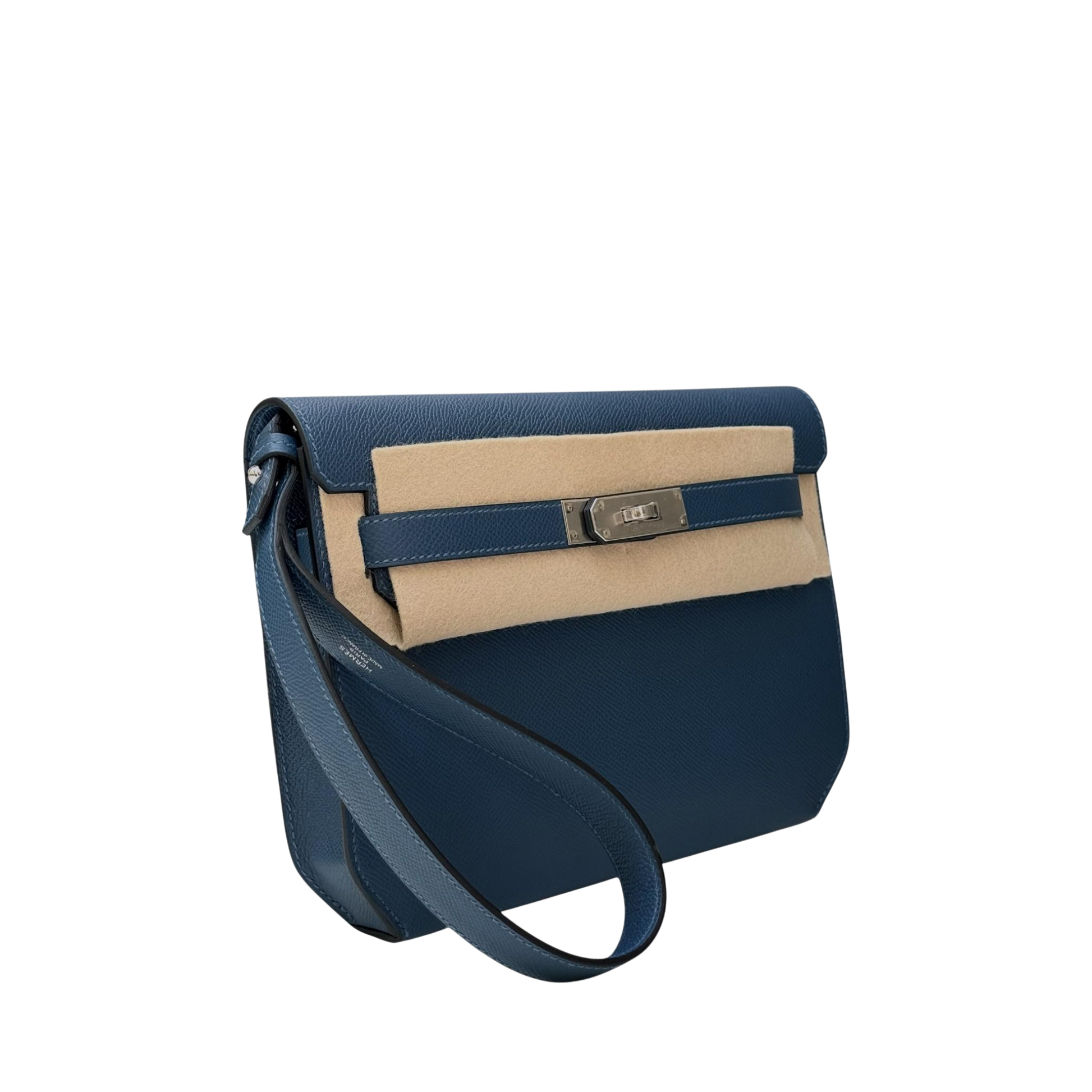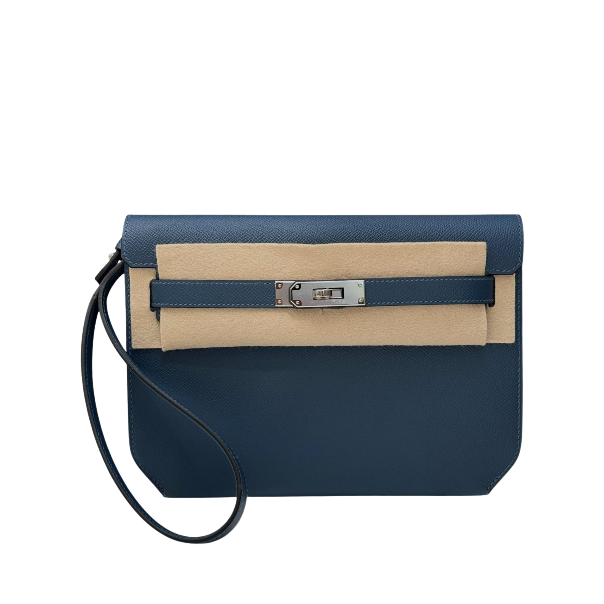 The Deep Blue Epsom leather Hermès Kelly Dépêches with Palladium Hardware are a sophisticated fusion of style and functionality. This elegant design, which is made of structured Epsom leather, features the classic Kelly silhouette reinvented as a sleek document or briefcase-style bag, making it appropriate for both formal and professional settings.
