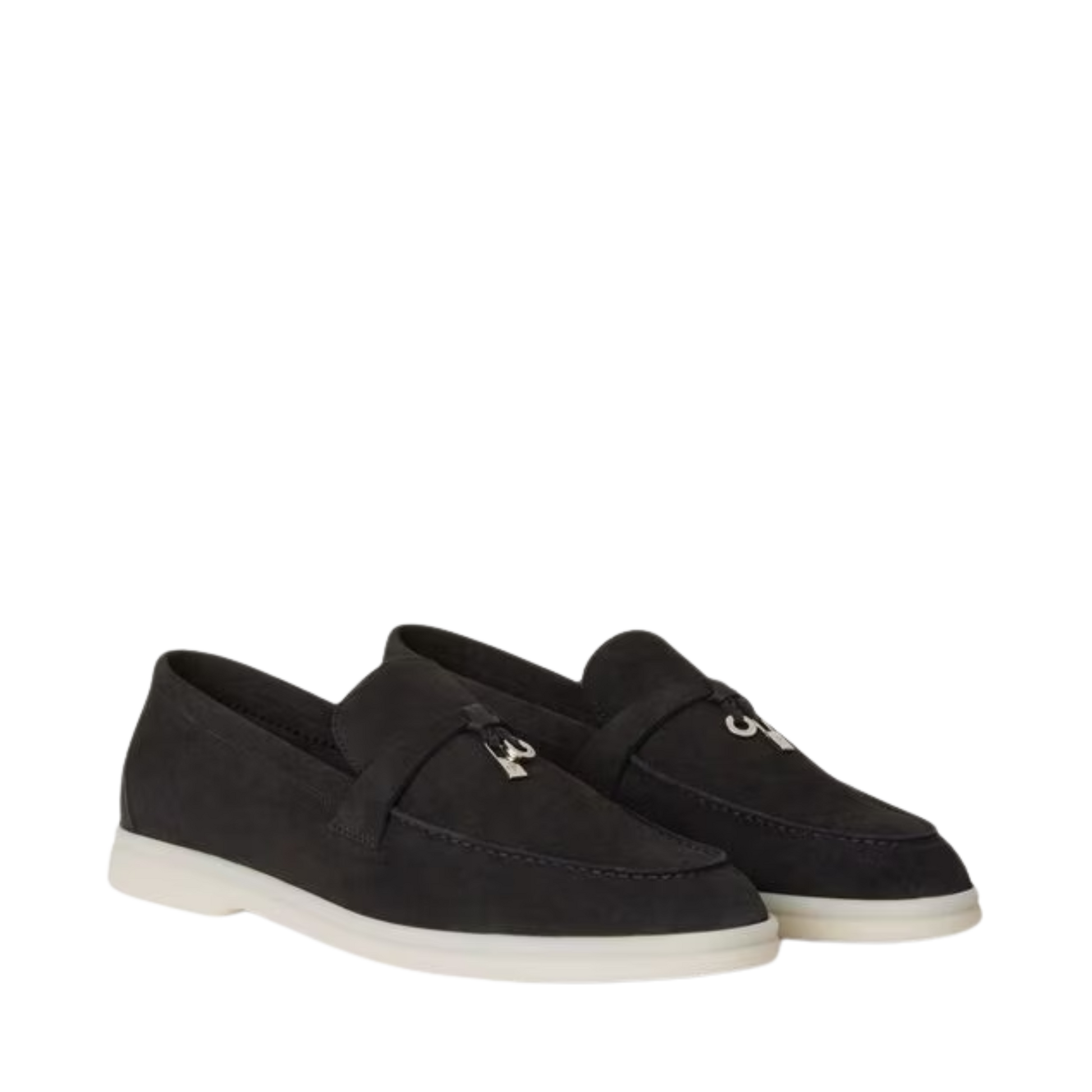 soft suede loafers that are sporty and comfortable. As with all Loro Piana sportswear shoes, they are improved with rubber soles. My Charms miniatures are used to adorn the front saddles. It's ideal for summertime sailing, beach, or urban settings.